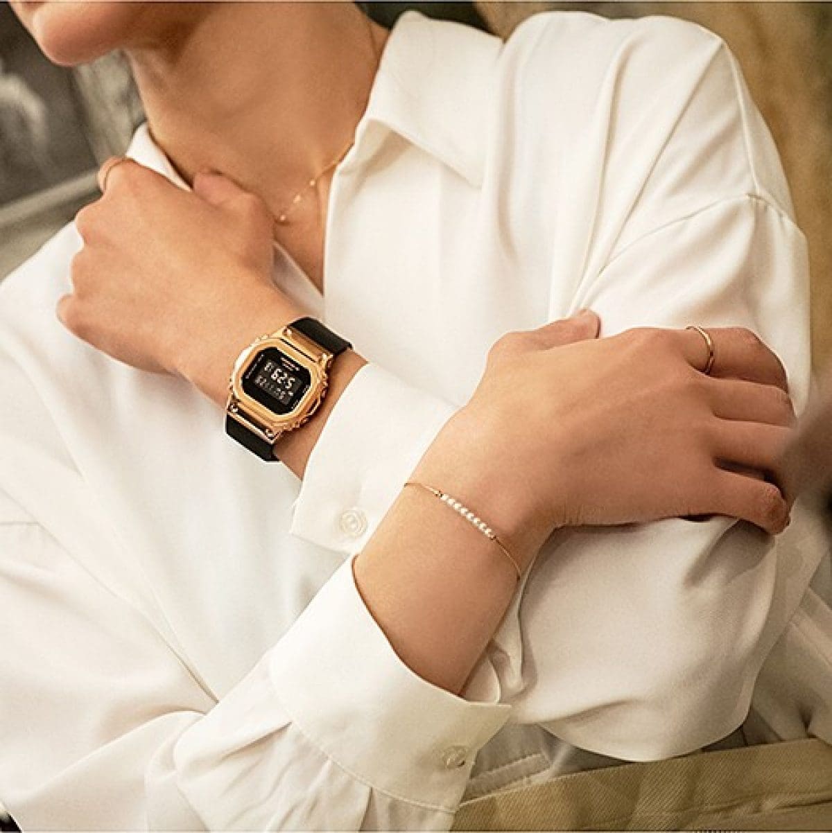A down-sized model of the iconic 5600 series with a metal finish. The square design of the GM-5600, which has been used since the first model, has been downsized to achieve a lightweight and comfortable fit. The bezel cover is made of metal with pink gold ion plating, and the band is an elegant G-SHOCK band in black.A down-sized model of the iconic 5600 series with a metal finish. The square design of the GM-5600, which has been used since the first model, has been downsized to achieve a lightweight and comfortable fit. The bezel cover is made of metal with pink gold ion plating, and the band is an elegant G-SHOCK band in black.